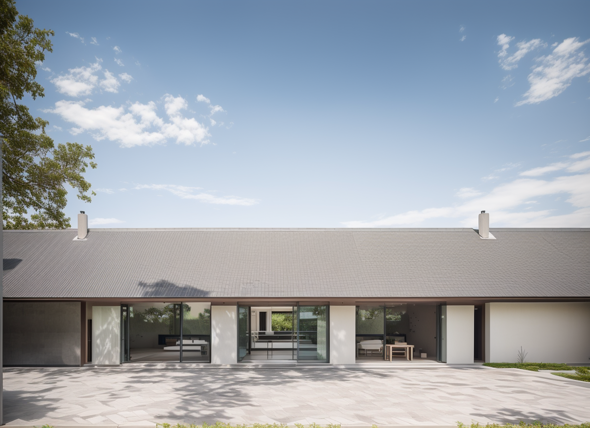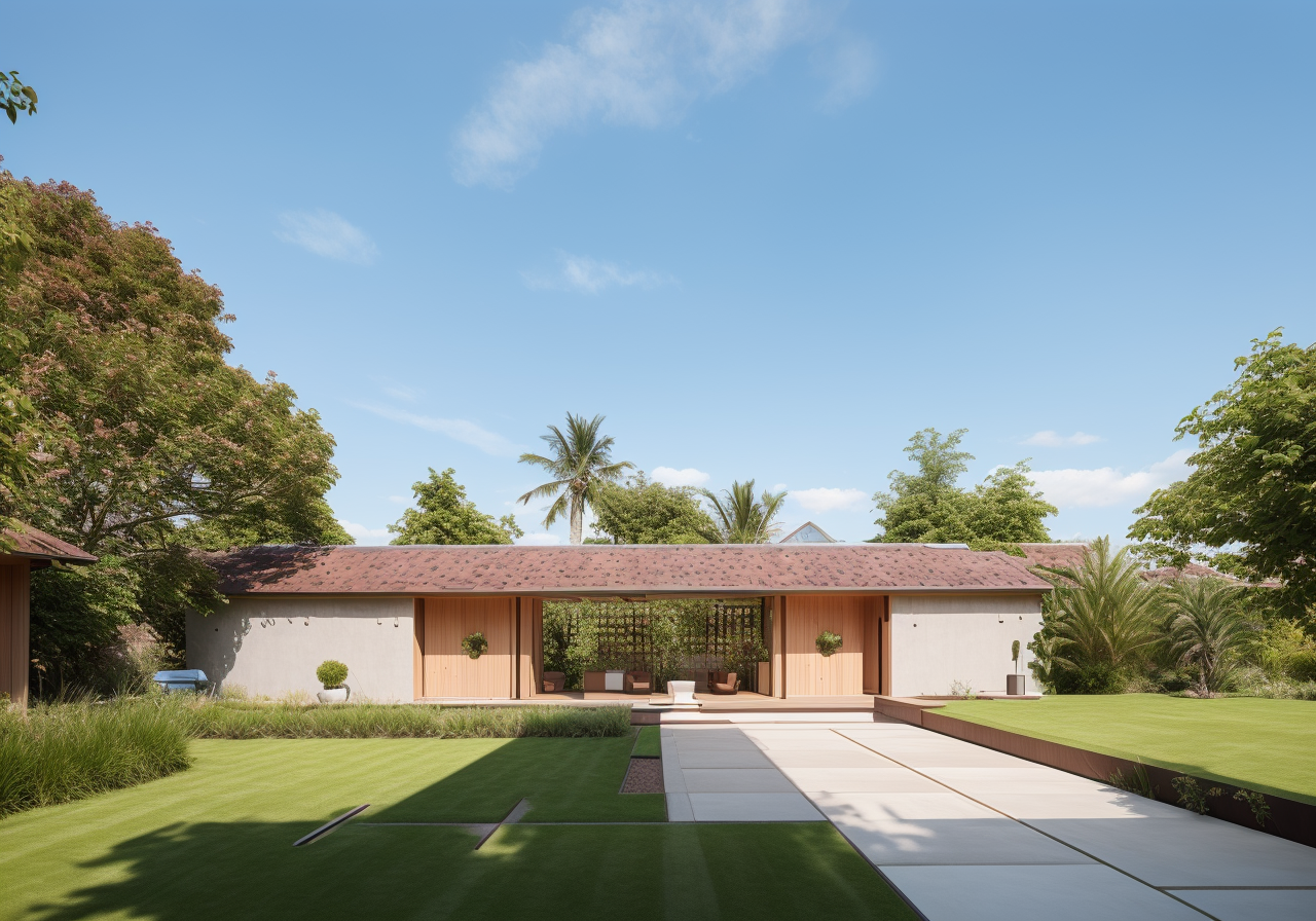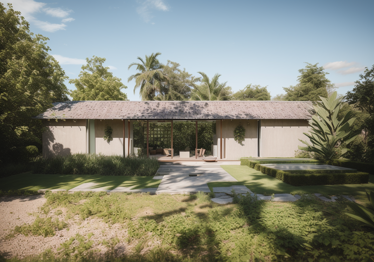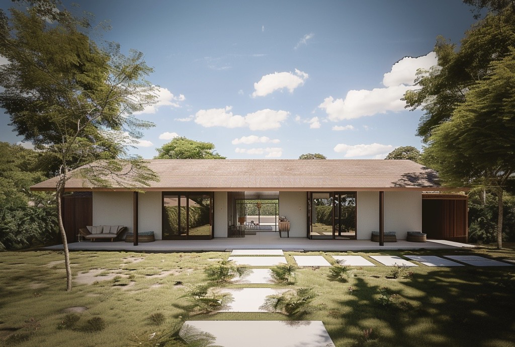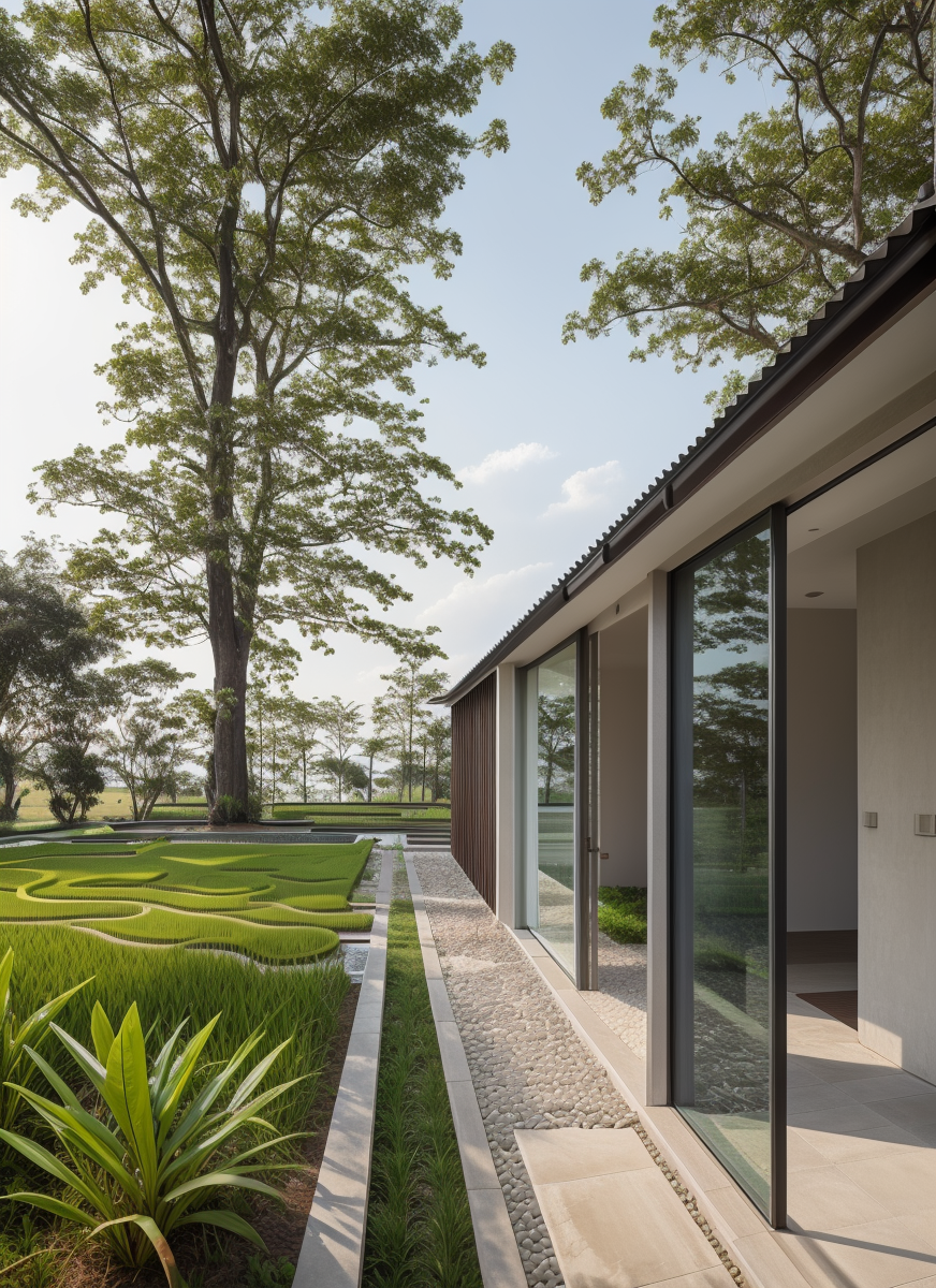 Ngôi nhà vườn một tầng này rộng lớn với chiều ngang 20 mét và chiều sâu 6 mét, tạo nên một không gian sống rộng rãi và thoáng đãng. Mái nhà được lợp ngói theo phong cách truyền thống, ngói được mua lại từ các nhà cũ đã phá bỏ, mang đến vẻ đẹp cổ kính nhưng không kém phần tinh tế và hiện đại. Kiến trúc của ngôi nhà được lấy cảm hứng từ những ngôi nhà 5 gian truyền thống của Việt Nam, với việc sử dụng các vật liệu và thiết kế đương đại để tạo nên một diện mạo mới mẻ.