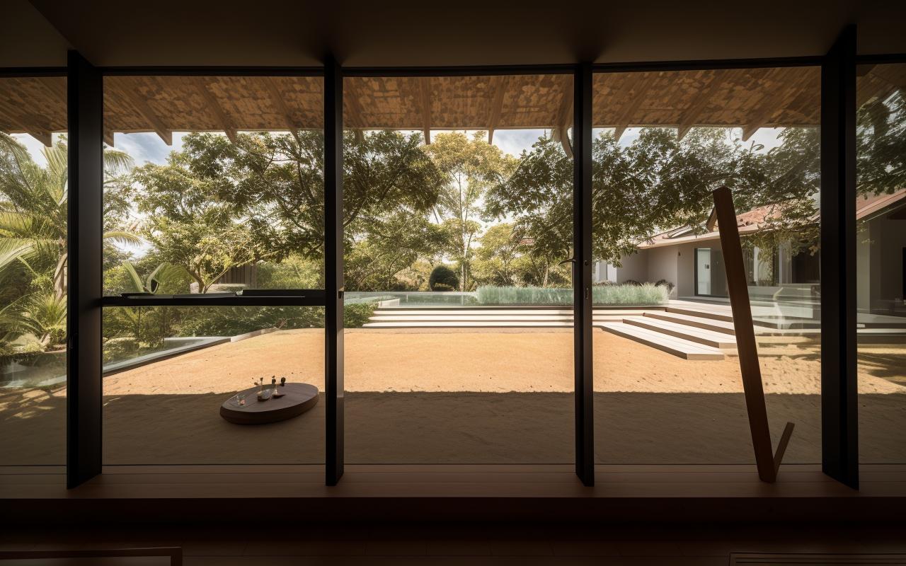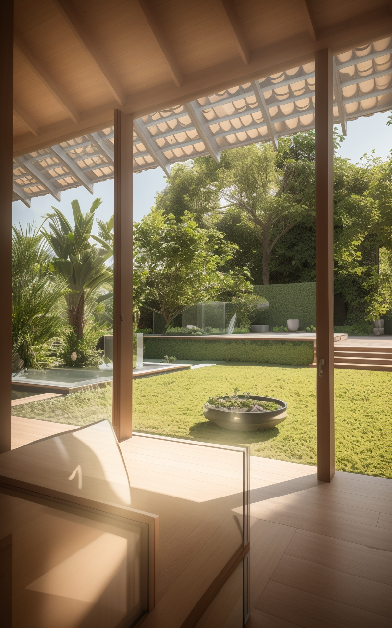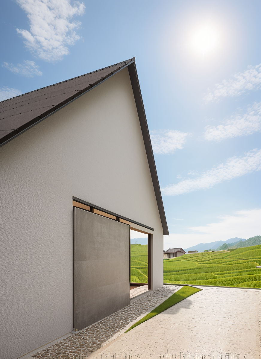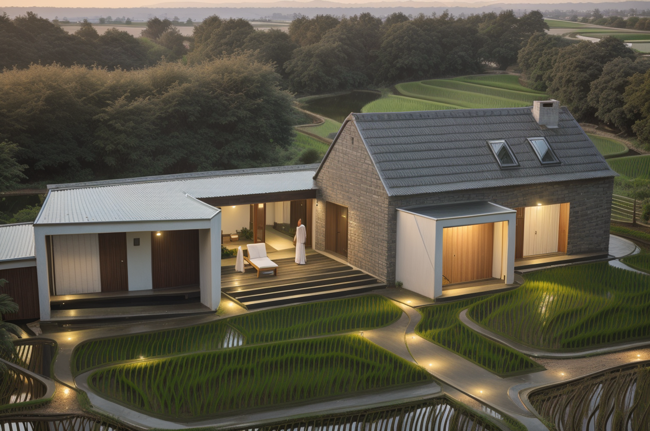 Ngôi nhà vườn một tầng này rộng lớn với chiều ngang 20 mét và chiều sâu 6 mét, tạo nên một không gian sống rộng rãi và thoáng đãng. Mái nhà được lợp ngói theo phong cách truyền thống, ngói được mua lại từ các nhà cũ đã phá bỏ, mang đến vẻ đẹp cổ kính nhưng không kém phần tinh tế và hiện đại. Kiến trúc của ngôi nhà được lấy cảm hứng từ những ngôi nhà 5 gian truyền thống của Việt Nam, với việc sử dụng các vật liệu và thiết kế đương đại để tạo nên một diện mạo mới mẻ.