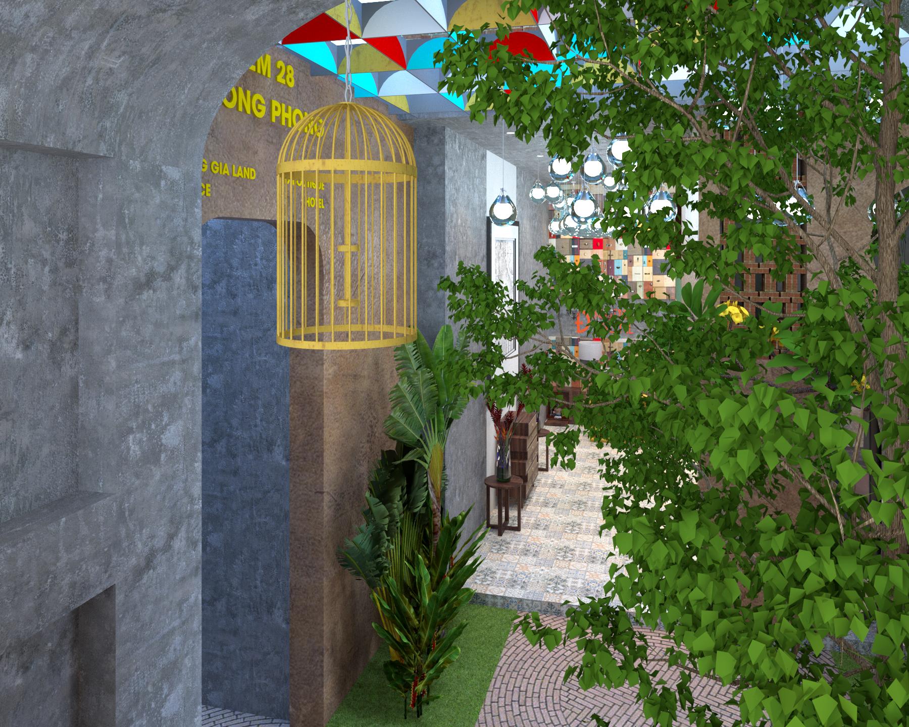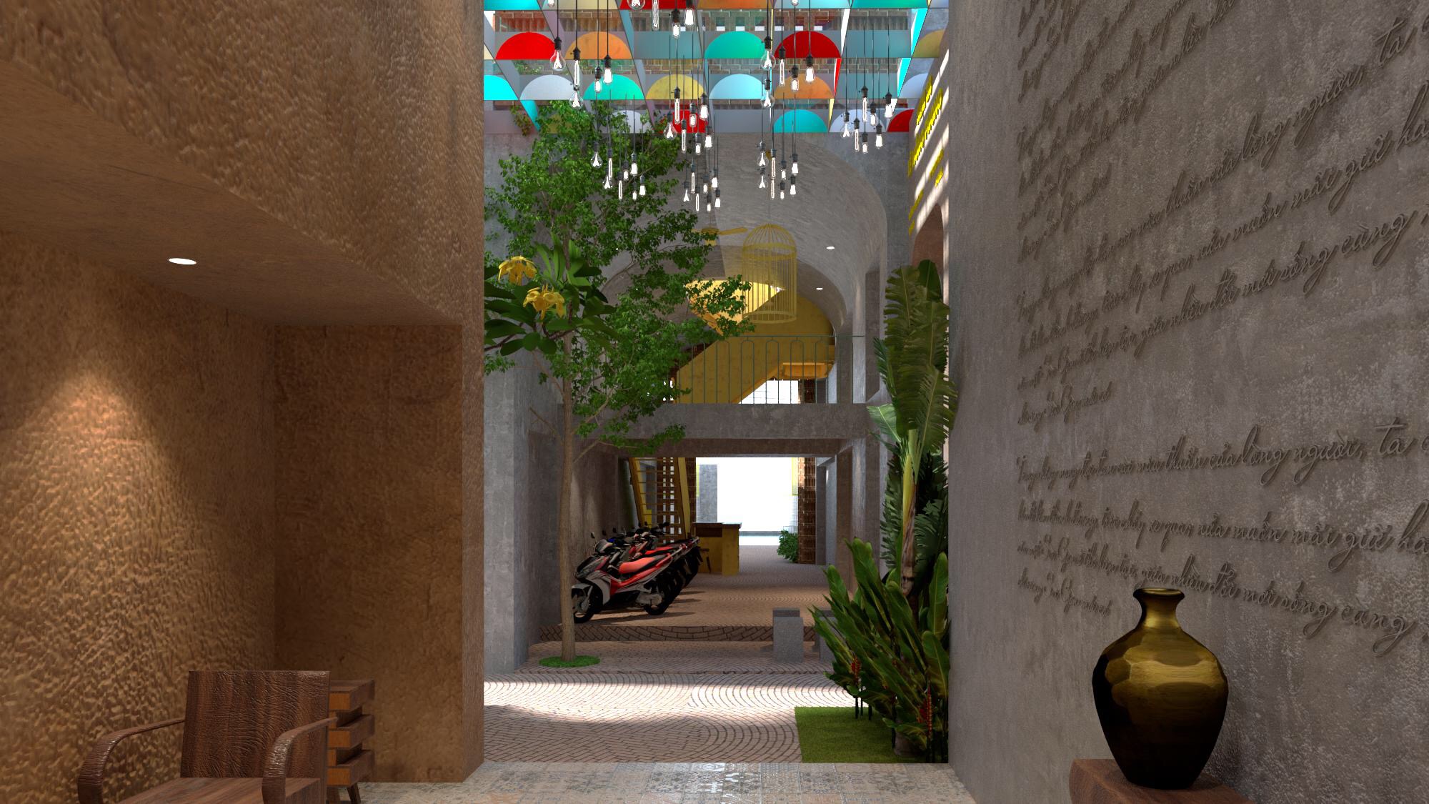 Công trình được hình thành bởi 1 vỏ bọc bằng gạch với ngôn ngữ hình khối tối giản nhưng được nhấn mạnh bởi không gian bên trong nó. Tất cả đều dựa trên những cái “hồn” của hẻm Sài Gòn. Lối vào chính được tổ chức một sân vườn nhỏ có ghế ngồi và những cái lồng chim nhỏ, sân vườn này được bao bọc bởi một “lồng chim” lớn và cây cối đan xen, nơi đây giống như những không gian sinh hoạt thường thấy của người dân nhiều khu phố Sài Gòn. Tầng 1 khối trước được tổ chức như một “hẻm” giao thông kết hợp “hẻm tranh” – Art gallery, cũng có thể là không gian triển lãm những tác phẩm về Sài Gòn. Tôi gợi ý chủ đầu tư biến nơi đây thành Art Gallery miễn phí cho tác phẩm độc đáo và tâm huyết của các họa sỹ. “Hẻm tranh” kết nối với Sảnh khách sạn thông qua một con hẻm với chiều ngang 2 m rất hẹp, vì thế tôi mở rộng khu vực này bằng cách tạo ra 1 sân trong lớn sau khi dành những phần diện tích từ 2 khu đất công trình. Khu vực này cũng là nơi thư giản và không gian cộng đồng trong hẻm, nơi con người có thể kết nối, tương tác với nhau và kết nối với tự nhiên khi nơi đây được gia tăng cây xanh, thảm cỏ, những cái ghế đá, lồng chim…Mái của sân trong được bố trí vừa che mưa, vừa lấy sáng, được trang trí cảm hứng từ những chiếc ô, càng nhấn mạnh điều kiện thời tiết Sài Gòn-những cơn mưa nhiều kỷ niệm Không gian đón tiếp của khách sạn gồm sảnh đón tiếp, khu khách đợi được bố trí gần khu vực giếng trời với hồ nước và cây xanh trong nhà được sử dụng ngôn ngữ thiết kế hoài cổ, vật liệu thân thiện môi trường và những hình ảnh thân thuộc với người Sài Gòn xưa. Điểm nhấn cho tất cả không gian này chính là hồ nước giếng trời, nơi có thể hứng mưa rơi xuống, để du khách có thể “chạm” với thiên nhiên ngay trong nhà. Toàn bộ phòng ngủ đều có thể lấy sáng, lấy gió tự nhiên thông qua các giếng trời và hẻm.
